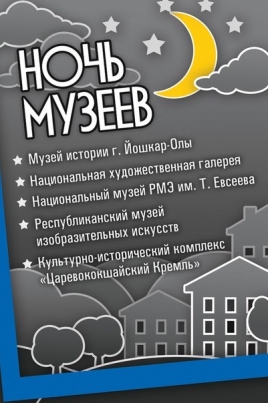 Отдых и развлеченияВ год культуры вновь состоится акция "Ночь в музее" с 17 на 18 мая. В мероприятии примут участие музеи города Йошкар-Олы: Национальный музей им. Т. Евсеева, Национальная художественная галерея, Республиканский музей изобразительных искусств, музей истории города Йошкар-Олы и информационно-туристский центр “Царевококшайский кремль”.