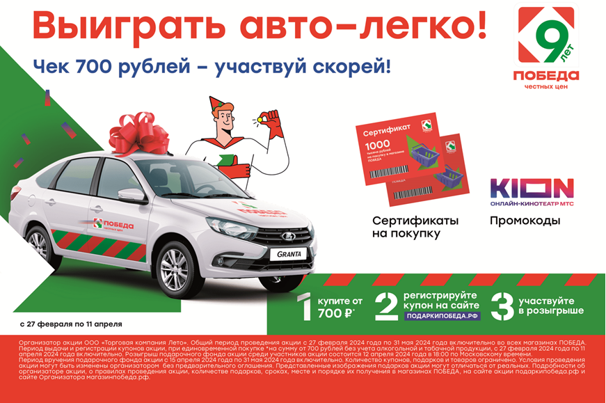 Но на этом подарки не заканчиваются! Торговая сеть ПОБЕДА подготовила для любимых покупателей другие ценные подарки: сертификаты на покупку от 500 до 5000 рублей, подписку от 3 до 12 месяцев на online-кинотеатр KION (12+).