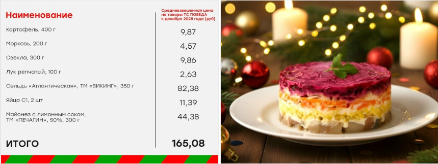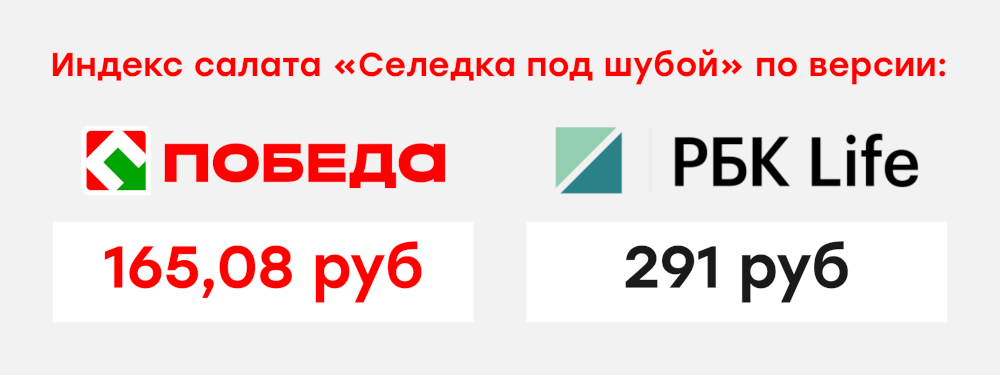 Таким образом, четыре порции салата «Селедка под шубой» покупателям ТС ПОБЕДА выйдут на 56% дешевле, всего в 165,08 руб., тогда как в среднем по стране такой набор продуктов стоит 291 руб.