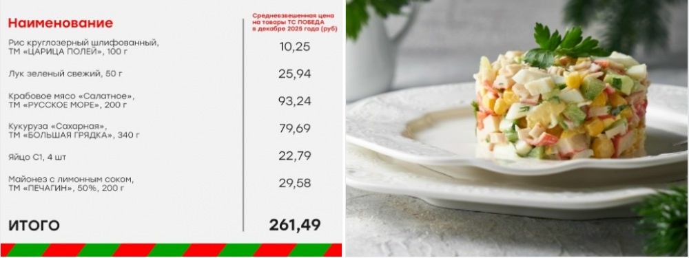 В магазине ПОБЕДА набор ингредиентов на 4 порции крабового салата стоит 261,49 руб. — что всего на 8,78 руб. дороже, чем в 2024 году (252,71 руб.). Учитывая уровень инфляции в 9%, салат стал выгоднее.