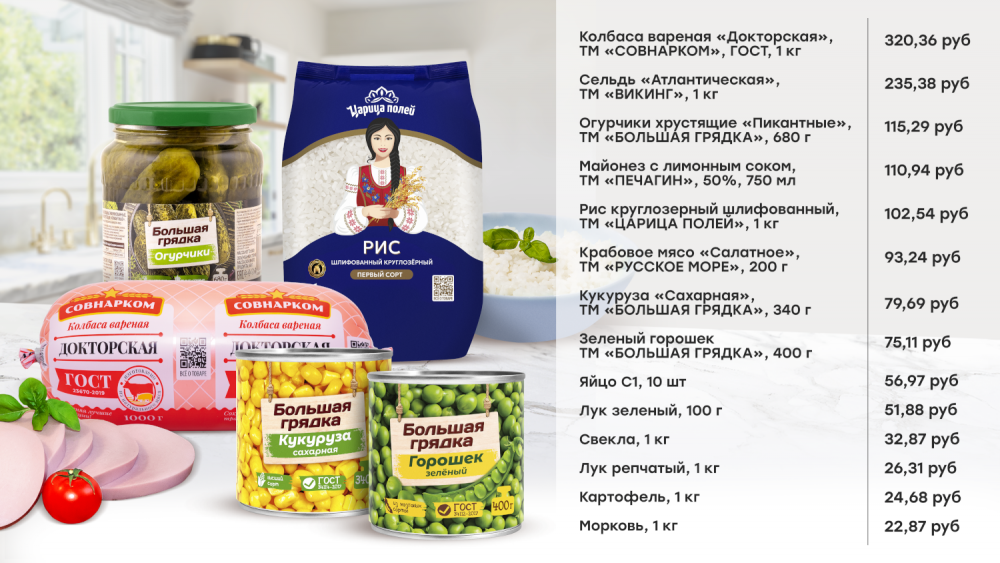 В магазине ПОБЕДА ингредиенты на 4 порции классического «Оливье» обойдутся в 332,98 руб. По сравнению с «Селедкой под шубой» «Оливье» подорожал, но не сильно. В 2024 году он стоил 292,01 руб., что всего на 41 руб. дешевле текущего года. Если смотреть среднюю цену по стране, то тут покупатели ТС ПОБЕДА получат явную экономию в 243 руб.