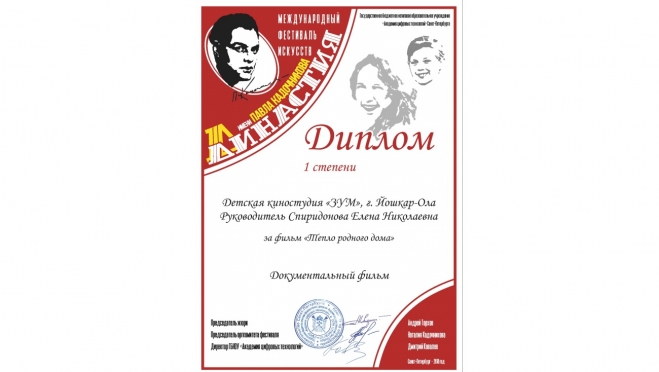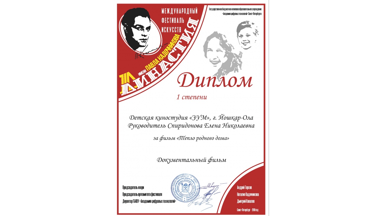 На IV Международный фестиваль искусств им Павла Кадочникова студийцы детской киностудии «ЗУМ» ГБУК РМЭ РМИИ города Йошкар-Ола Хайруллин Руслан, Померанцев Андрей, Видякин Даниил, Норкин Артемий представили на суд жюри документальный фильм «Тепло родного дома» о династии семьи Шабдаровых из марийской глубинки. Идея фильма «Тепло родного дома»: династия — это не призвание, не профессия. Это имя, это имидж семьи, ее знамя. Быть похожим на родителей — это значит взять от них все самое ценное, развивать, улучшать, совершенствовать и приумножать этот багаж, и передавать его своим детям. Давайте жить так, чтобы наши дети гордились нами, стремились быть похожими на нас, были лучше нас! Любви и добра вам!