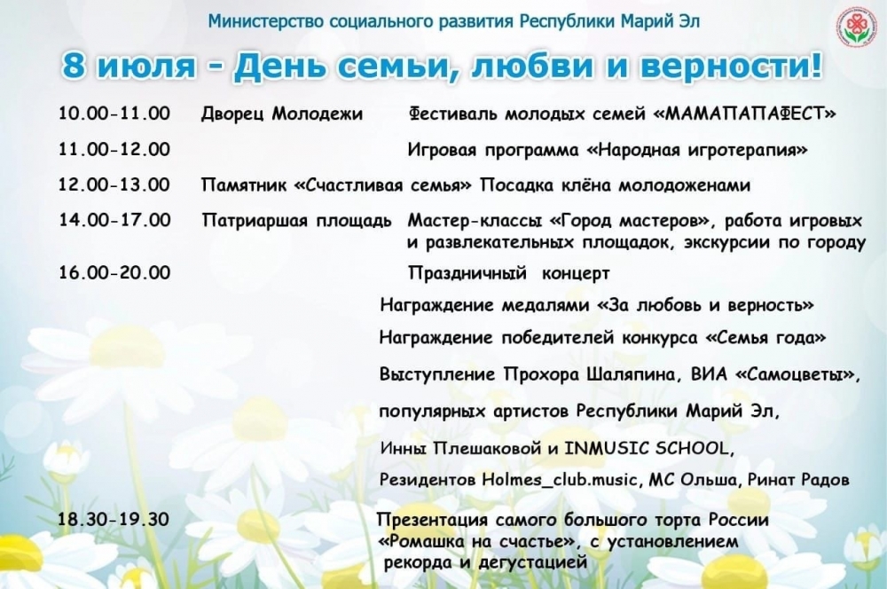 Сегодня,8 июля, отмечается семейный праздник, посвящённый памяти Святых Петра и Февронии — День семьи, любви и верности. Жители и гости Йошкар-Олы в этот день смогут насладиться интересной и насыщенной программой, а также попробовать торт в форме ромашки!