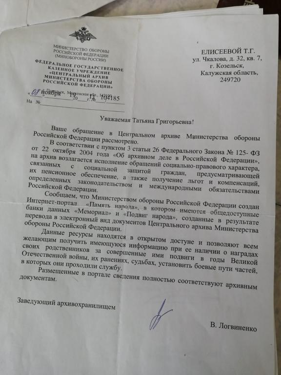 [29.04, 19:38] Фокина Елена Николаевна: Была в военкомате, просила уточнить дату рождения Ивана Фёдоровича. В архив, во Владимир, пока не попала. Родословную надо знать. Спасибо огромное поисковикам за труд!