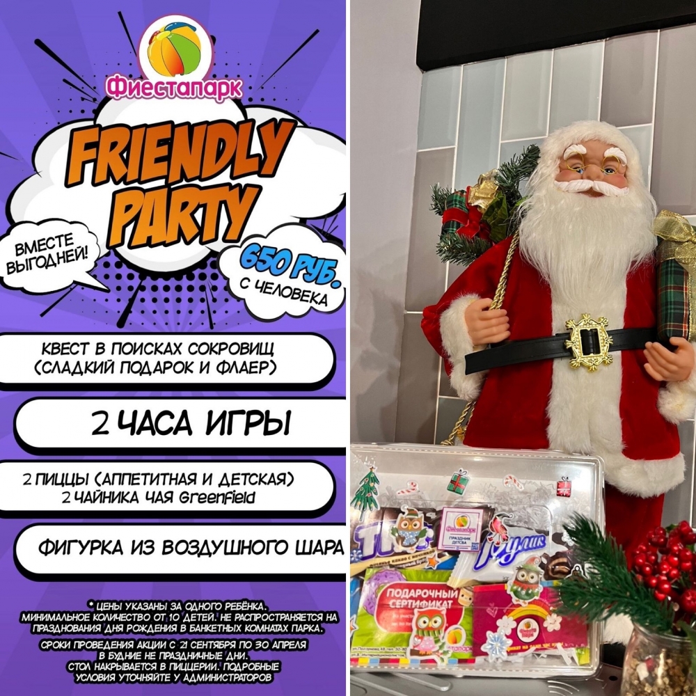 Перед Новым годом или в каникулы можно собраться группой, классом, дружной компанией и устроить Friendly Party*, в который входит целый набор развлечений: два часа игры, квест «В поисках сокровищ» (сладкий подарок и флаер), две пиццы и два чайника чая, а также фигурка из воздушного шара. Стоимость за одного ребёнка — 650 рублей**.