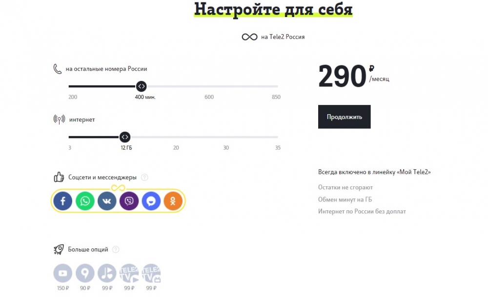 Чтобы настроить тариф под себя, достаточно зайти на сайт оператора и выбрать базовое предложение. К примеру, «Мой онлайн» с безлимитными соцсетями и мессенджерами.