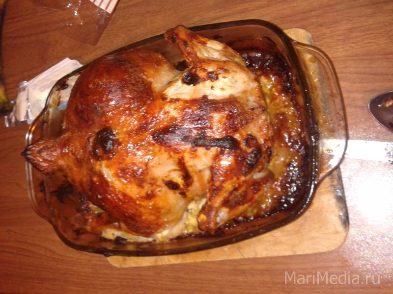 Рецепт блюда: Взять размороженную курицу через небольшой прорез извлечь все кости из курицы вплоть до крыльев. Далее взять и отварить шампиньоны 20-40 минут, отварить рис (20 минут) мелко нарезать репчатый лук, смешать рис, лук и мелко нарезанные отваренные шампиньоны. Набить тушку курицы, включая ножки и крылья. Зашить технологический прорез + зашить место у горла курицы. Далее нарезать чеснок мелко-мелко, чтобы дало сок. Намазать курицу чесноком, далее намазать курицу солью, втирая ее в течении 3 минут. Далее намазываем курицу жидким плавленным сыром + сверху покрываем тонким слоем майонеза желательно оливковым "Ряба" и ставим в духовку на 1 час. Далее вынимаем и приятного аппетита!