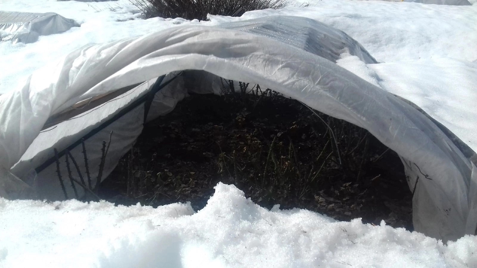 Если растения укрыты под каркасом, необходимо приоткрыть их и обеспечить приток свежего воздуха, даже если ночью минусовые температуры. Иначе кусты могут сильно подопреть, ведь под укрытием образуется парниковый эффект.