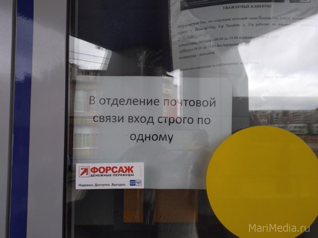 В настоящее время в Йошкар-Оле почтовые отделения работают в особом режиме, вход в помещение почты осуществляется в порядке живой очереди по одному человеку, чтобы минимизировать возможное заражение.