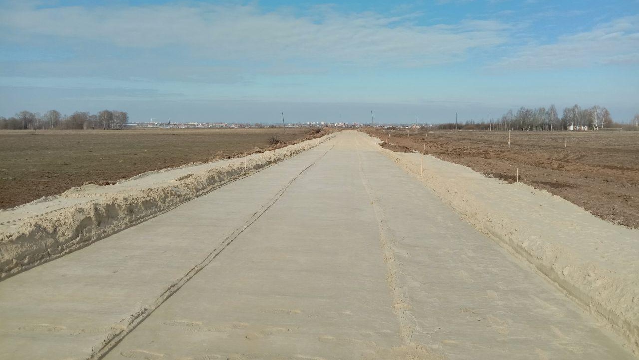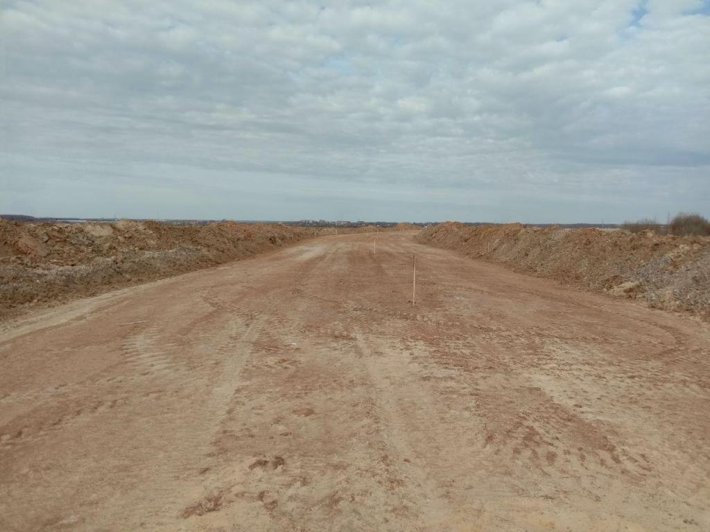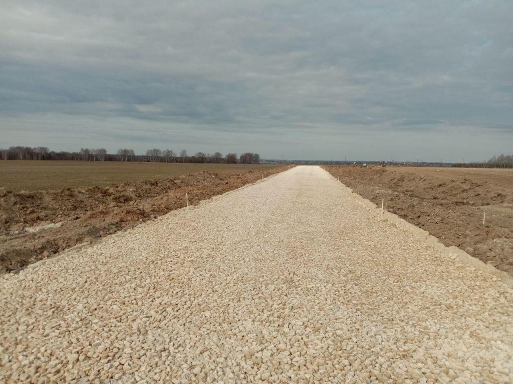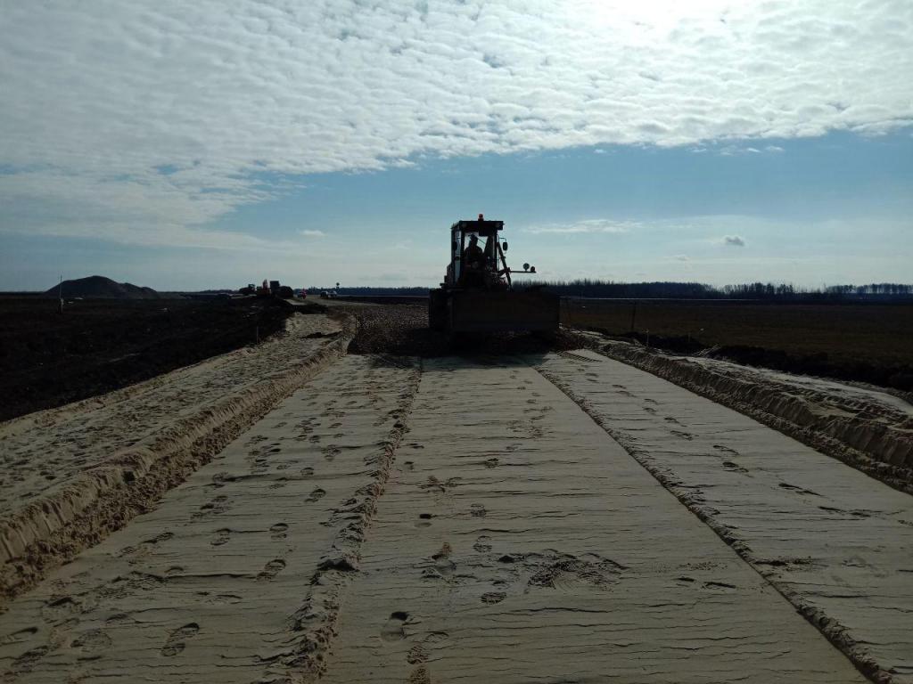 В настоящее время выполняются работы по устройству песчаного слоя дорожной одежды из мелкого песка. На втором участке выполняется устройство основания из щебня.