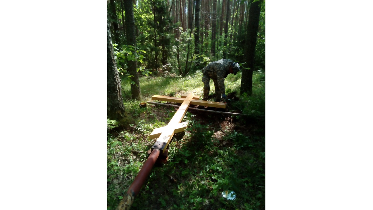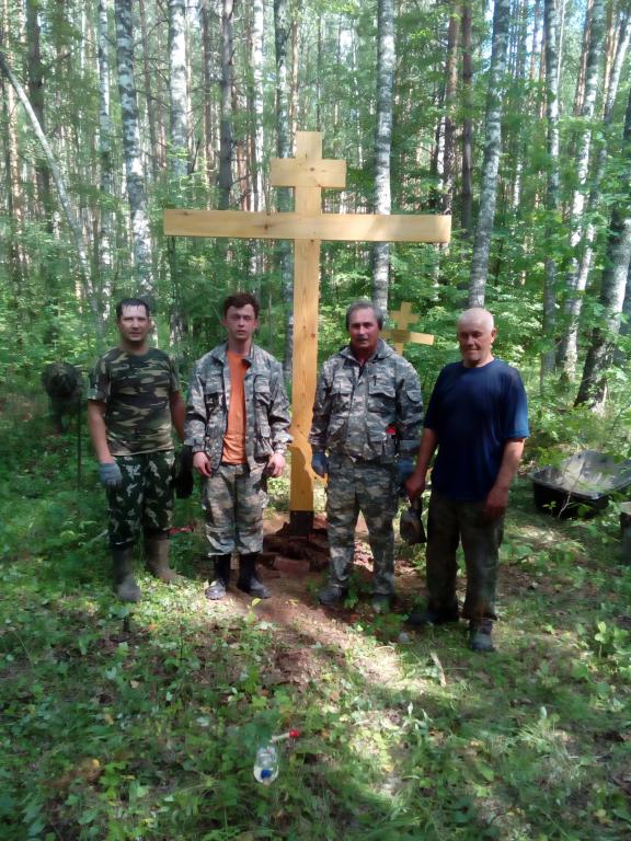 Крест появился на месте, где когда-то стоял храм. Хорошо сохранились столбы фундамента, по ним удалось чётко определить периметр храма. Крест установили в центральной части.