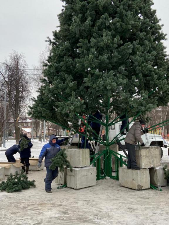 Сегодня в Парке завершена установка 15-метровой ели. В течение двух дней специалисты Дворца культуры им. В.И.Ленина собрали каркас, установили ветки и украсили шарами и иллюминацией.