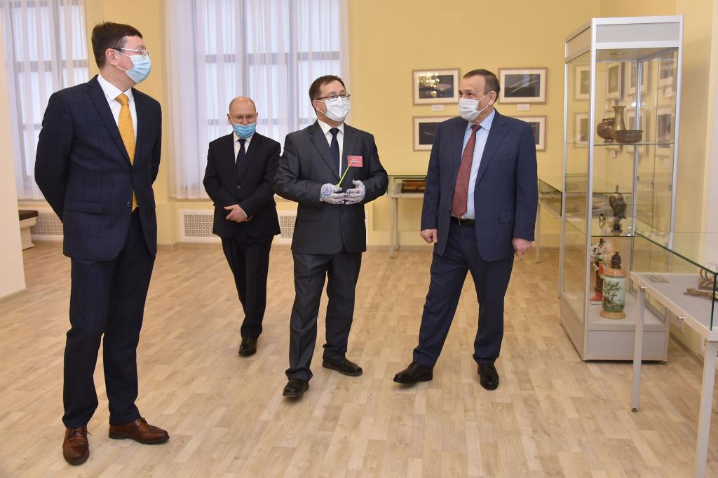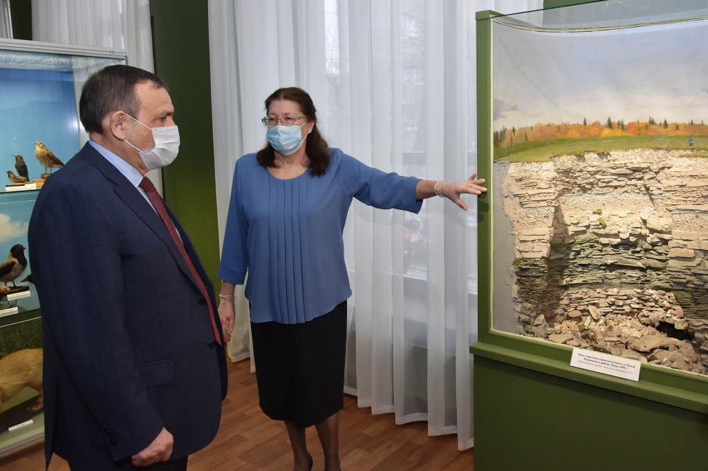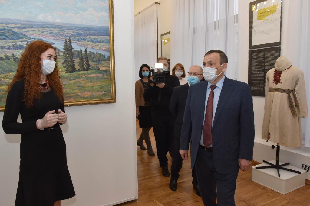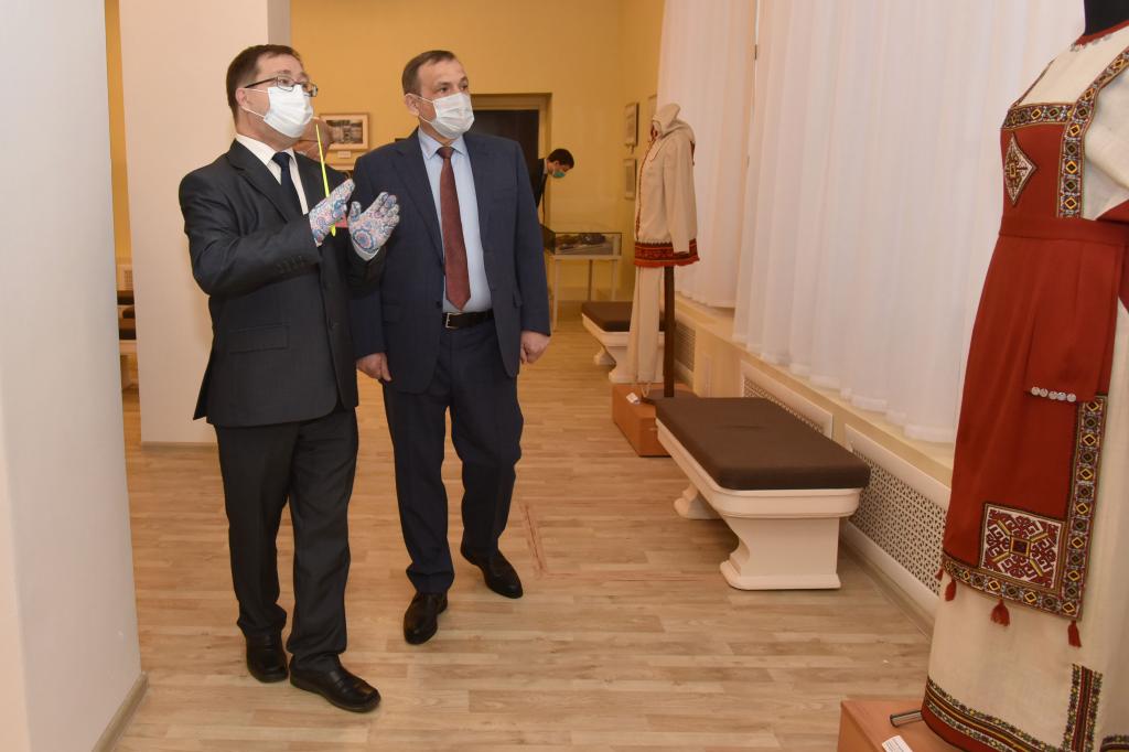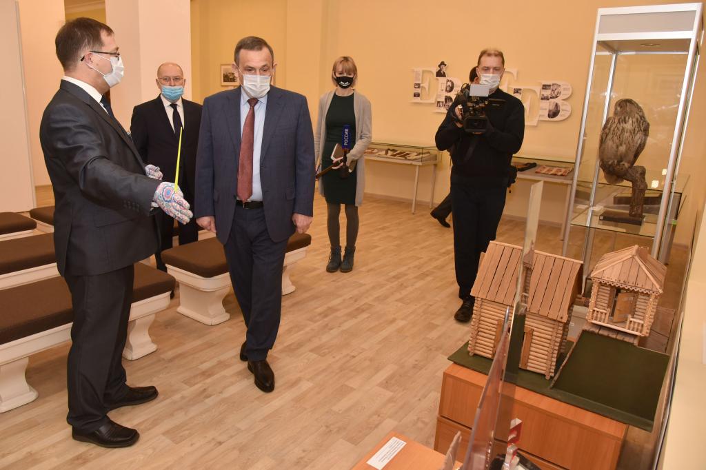 Старший научный сотрудник отдела истории Сергей Свечников представил Александру Евстифееву выставку «100 лет национальному музею Республики Марий Эл» и рассказал об основных этапах развития культурного учреждения.
