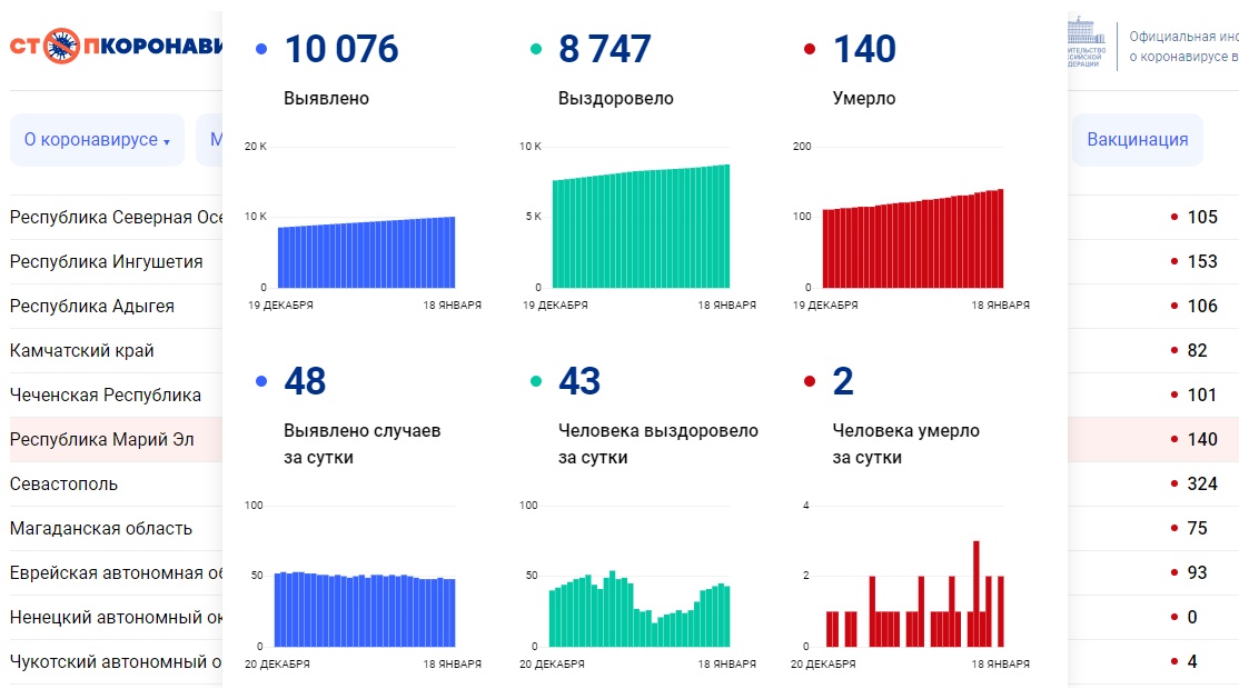 По информации сайта «стопкоронавирус.рф», за минувшие сутки в республике от коронавируса умерли двое жителей. Общее число жертв ковида составило 140 человек. За вчерашний день выявлено 48 новых случаев болезни. С начала пандемии в Марий Эл заболело 10 076 человек.