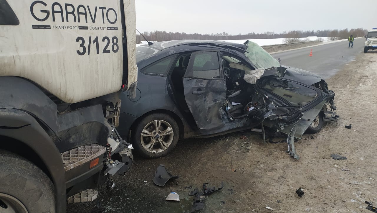 По данным УГИБДД МВД республики, водитель Ford Focus, по предварительным данным, в сложных дорожных условиях не справился с управлением, выехал на встречку и врезался в грузовик Scania.