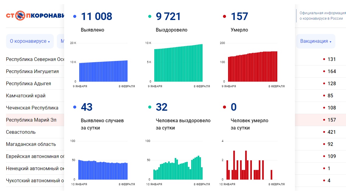 По информации сайта «стопкоронавирус.рф», за прошедшие сутки в Марий Эл выявлено 43 новых случая коронавируса. Всего с начала пандемии в республике заболели 11 008 человек. На данный момент в регионе болеют 1 130 человек. За вчерашний день выздоровели 32 человека, общее количество выздоровевших — 9 721. Число жертв ковида не увеличилось и по-прежнему составляет 157 человек.