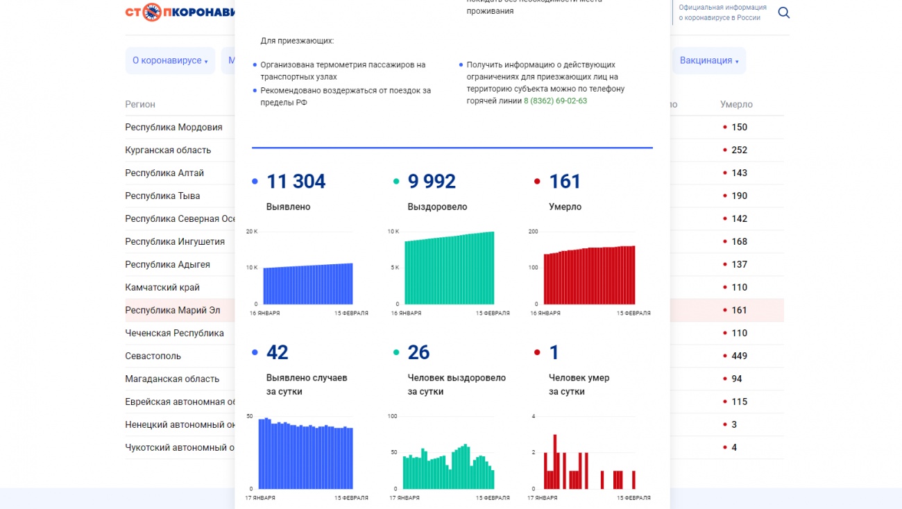 По информации сайта «стопкоронавирус.рф», в воскресенье, 14 февраля, в Марий Эл зафиксировано 42 новых случая COVID-19. Выздоровели за прошедшие сутки 26 человек, один житель республики скончался.