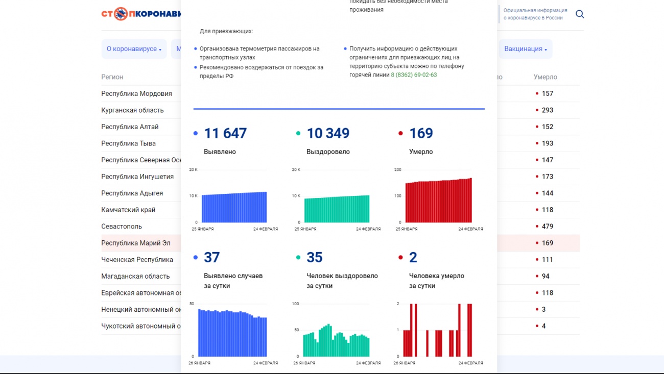 По информации сайта «стопкоронавирус.рф», в Марий Эл число заразившихся COVID-19 достигло 11 647 человек. За прошедшие два дня зарегистрировано сразу четыре смерти от ковида — два человека умерли 22 февраля, и ещё двое — 23 февраля. Всего на данный момент в республике болеет 1 129 человек. Прирост болезни стабилен — три дня подряд фиксируется по 37 новых случаев коронавируса.