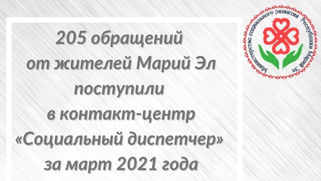 По информации Минсоцразвития Марий Эл, в марте от жителей Марий Эл поступили в контакт-центр «Социальный диспетчер» 205 обращений. Всего с начала года от жителей республики поступили 529 обращений. Большая часть обращений касалась вопросов предоставления мер социальной поддержки: различных видов детских пособий, субсидий на оплату жилого помещения и коммунальных услуг и другие.