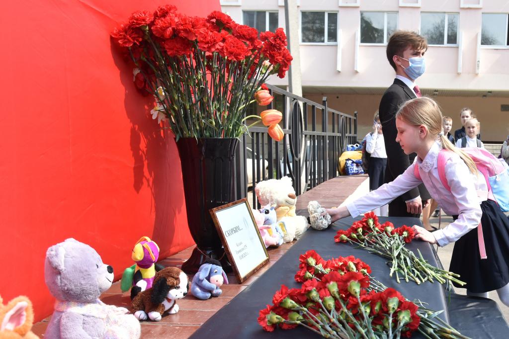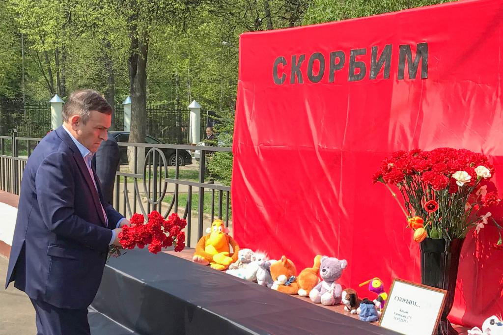 Цветы в память о погибших в Казани сегодня возложил глава региона Александр Евстифеев. Возле народного мемориала он почтил минутой молчания память безвременно ушедших детей и взрослых.