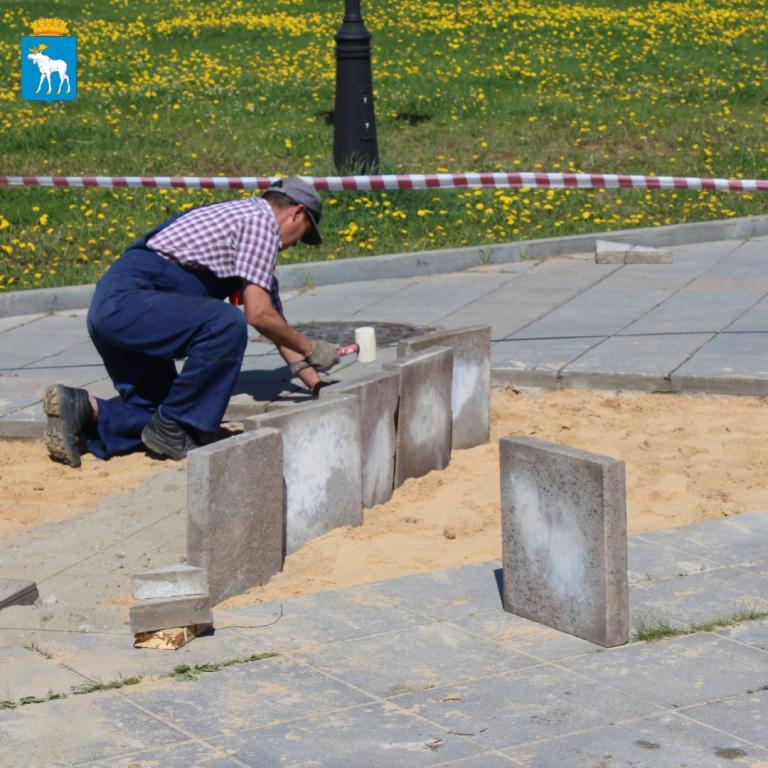 Сотрудники подрядной организации выровняли поверхность с помощью песка и строительной смеси, а также приступили к укладке плитки.