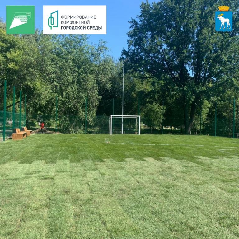 В настоящее время здесь подготавливают территорию для игры в мини-футбол. Она будет обустроена в юго-западной части парка. Подрядная организация уже уложила газонную траву на будущее игровое поле.