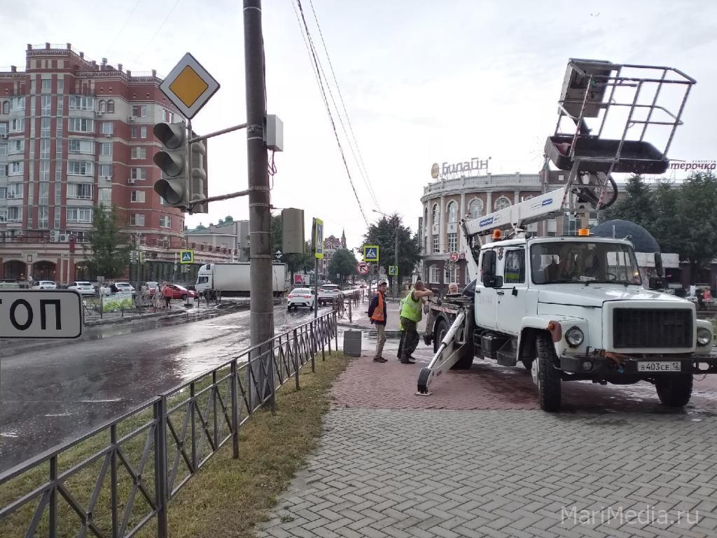 Из-за грозы в Йошкар-Оле светофор на бульваре Чавайна загорелся сразу тремя цветами.