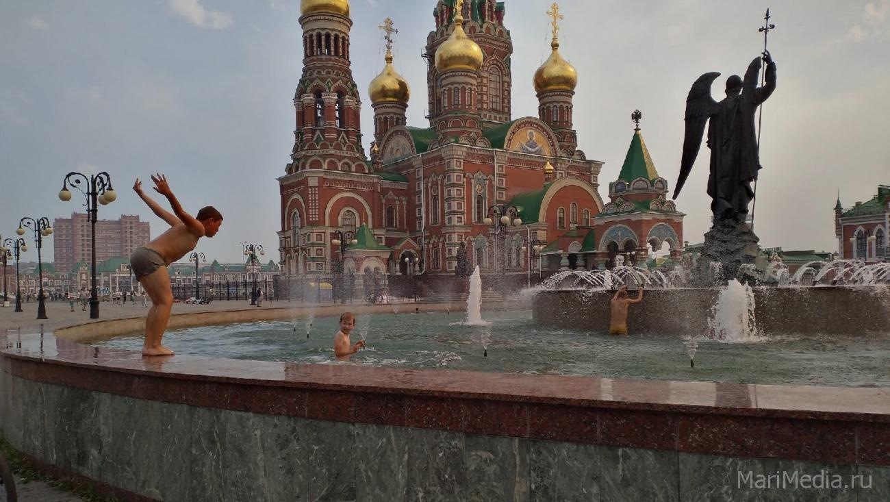 Жара продолжает испытать горожан на прочность. Дети нашли выход из этой ситуации и коротают время в воде. Для этого юные йошкаролинцы облюбовали городской фонтан «Архангел Гавриил».