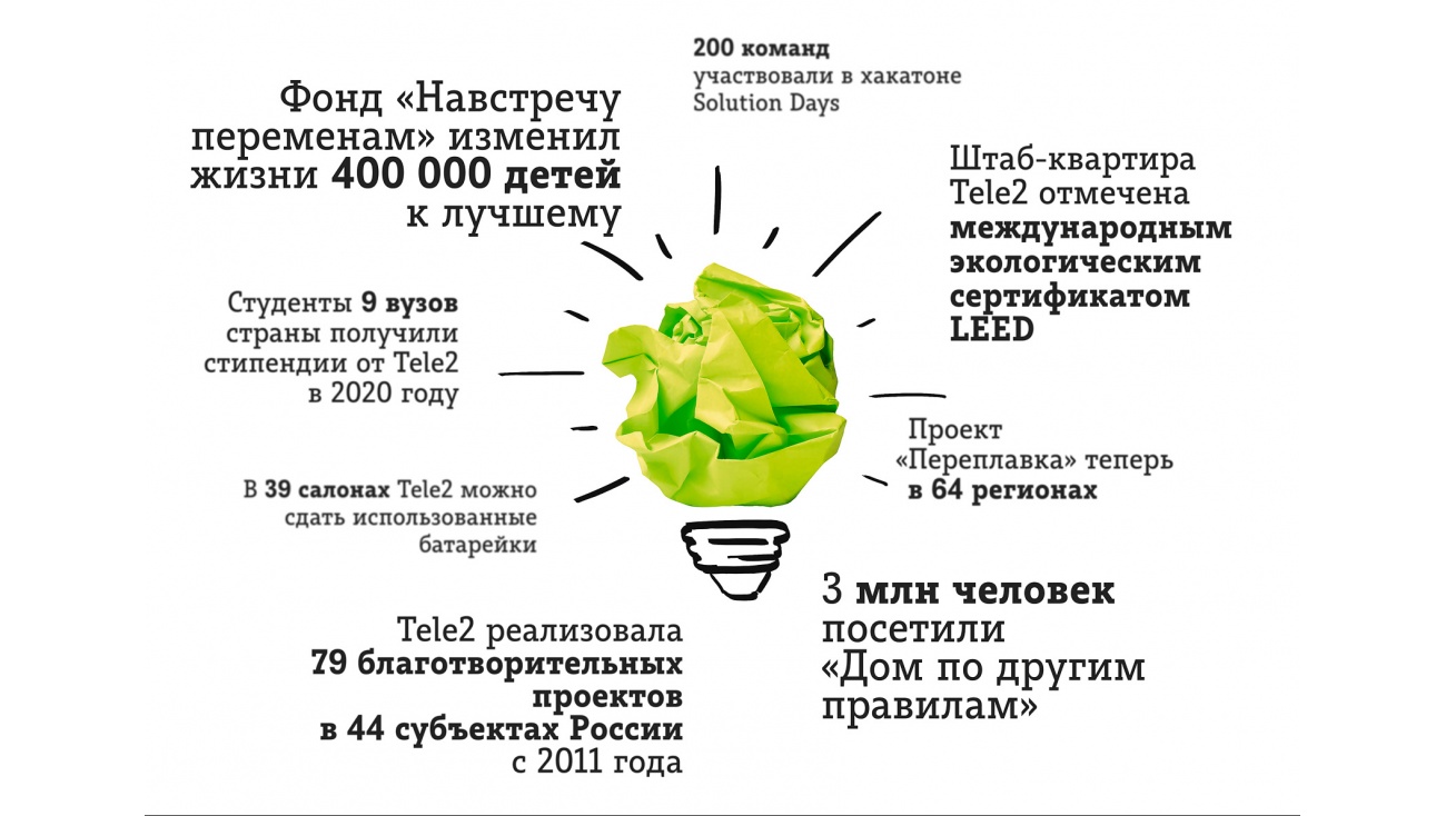 С самого начала работы в России Tele2 поддерживала талантливых социальных предпринимателей в рамках сотрудничества с фондом «Навстречу переменам». Tele2 видит социальную ответственность в создании развитой сети амбассадоров добра — лидеров, которые реально решают проблемы детей и подростков в регионах. Зная, с какими трудностями сталкиваются социальные стартапы, в пандемийный год Tele2 и фонд скорректировали формат конкурса и решили поддержать уже действующие проекты. Победители получили финансирование по 650 тыс. и помощь в разработке антикризисной стратегии.