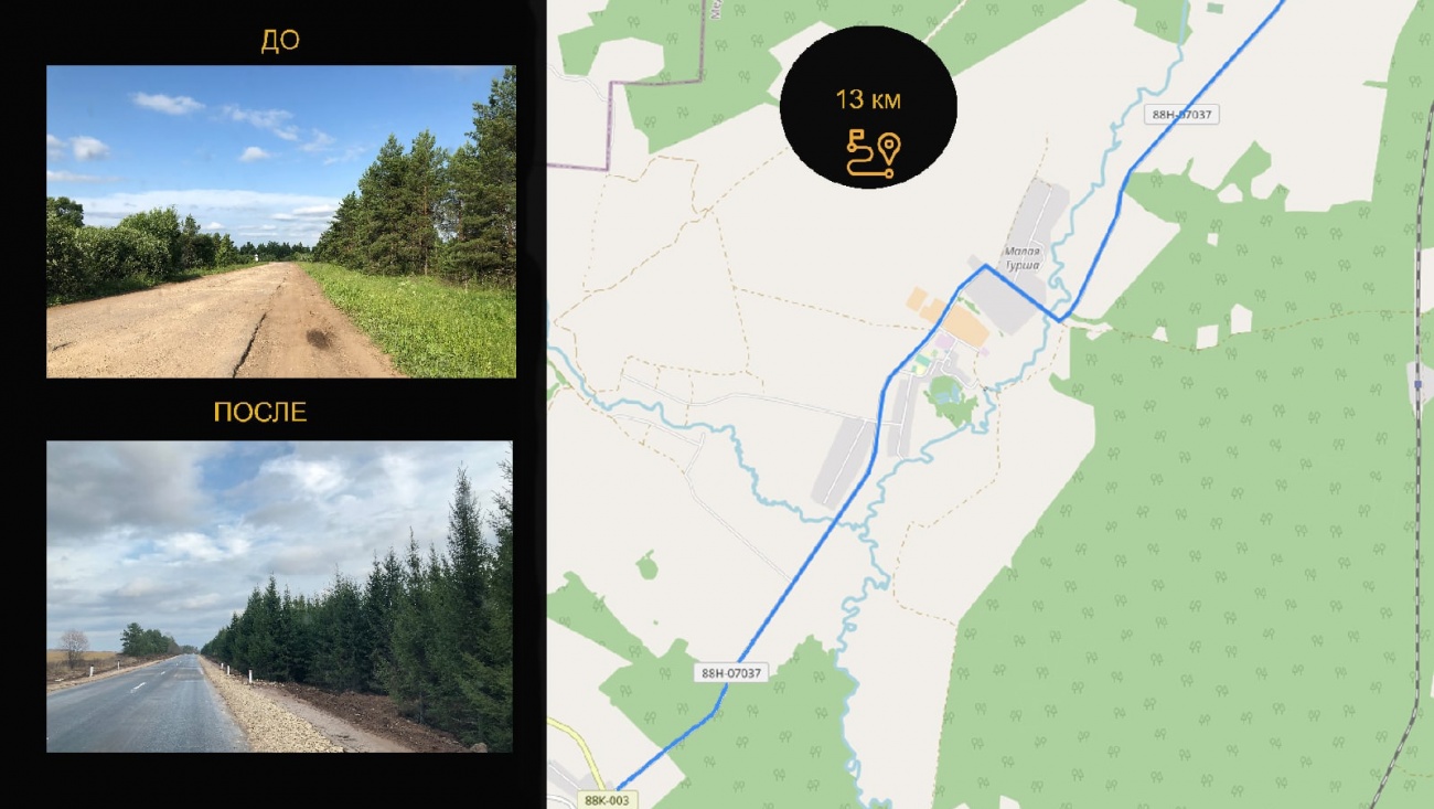 Первая из них — автомобильный участок «Малая Речка — Пижма — Юж-Толешево» протяжённостью 13 км.
