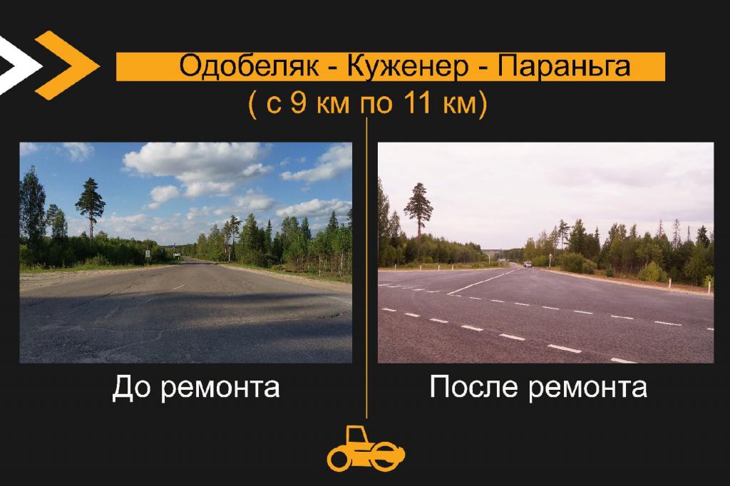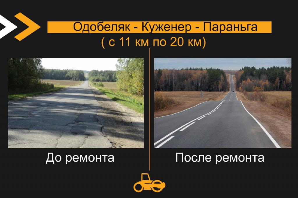 На дороге «Одобеляк — Куженер — Параньга» будет несколько этапов работ. В 2020 году здесь отремонтировали участок с 11 км по 21 км, в 2021 — с 9 км по 11 км. В 2024 году запланирован ремонт с 0 км по 5 км.