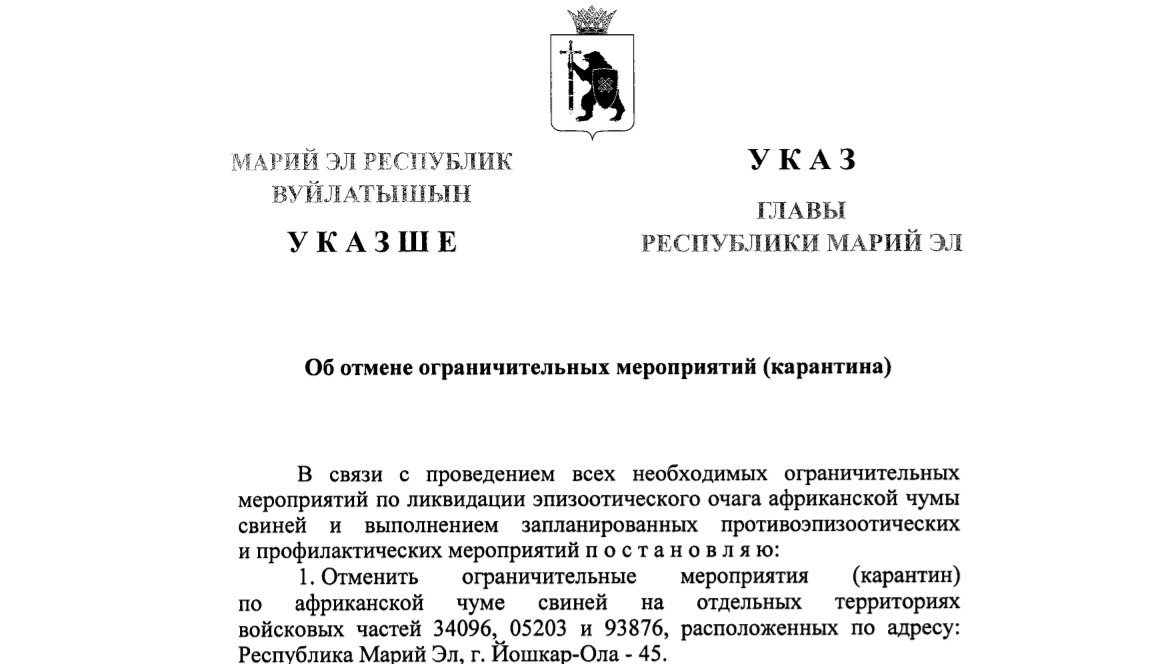 В связи с проведением всех необходимых ограничительных мероприятий по ликвидации эпизоотического очага африканской чумы свиней и выполнением запланированных противоэпизоотических и профилактических мероприятий отменён карантин по АЧС на территории войсковых частей: 34096, 05203, 93876, расположенных по адресу: Йошкар-Ола — 45.