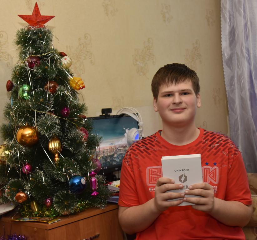 Шар Дмитрия Стрельникова с пожеланием снял с новогодней ёлки Александр Евстифеев. Мальчик любит читать и давно мечтал получить на Новый год электронную книгу.