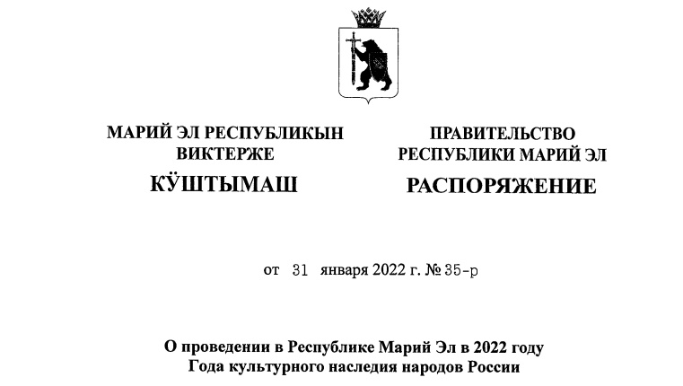 Во исполнении Указа президента страны от 30.12.2021 года «О проведении в Российской Федерации Года культурного наследия народов России» и в целях поддержки и развития культурного наследия Республики Марий Эл принято решение на уровне правительства региона — провести в Марий Эл «Года культурного наследия народов России».