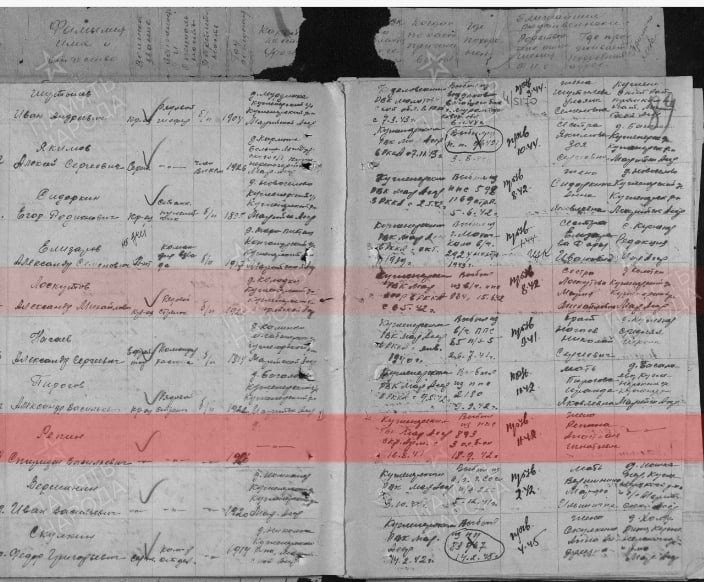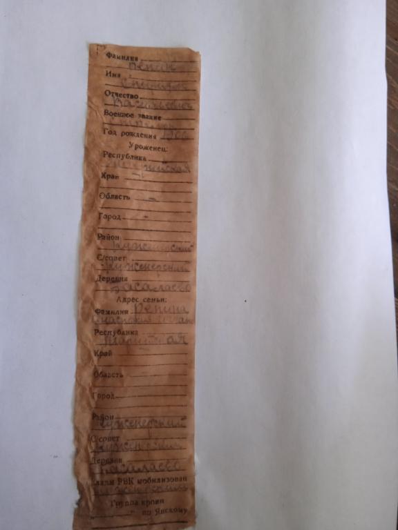 «Репин Спиридон Васильевич, стрелок, 1906 г.р., уроженец Марийской республики, Куженерского района, Куженерского с/с, деревня Басалаево, призван Куженерским РВК, семья Репина Анастасия Игнатьева проживает Марийская республика, Куженерского района, Куженерского с/с деревня Басалаево».