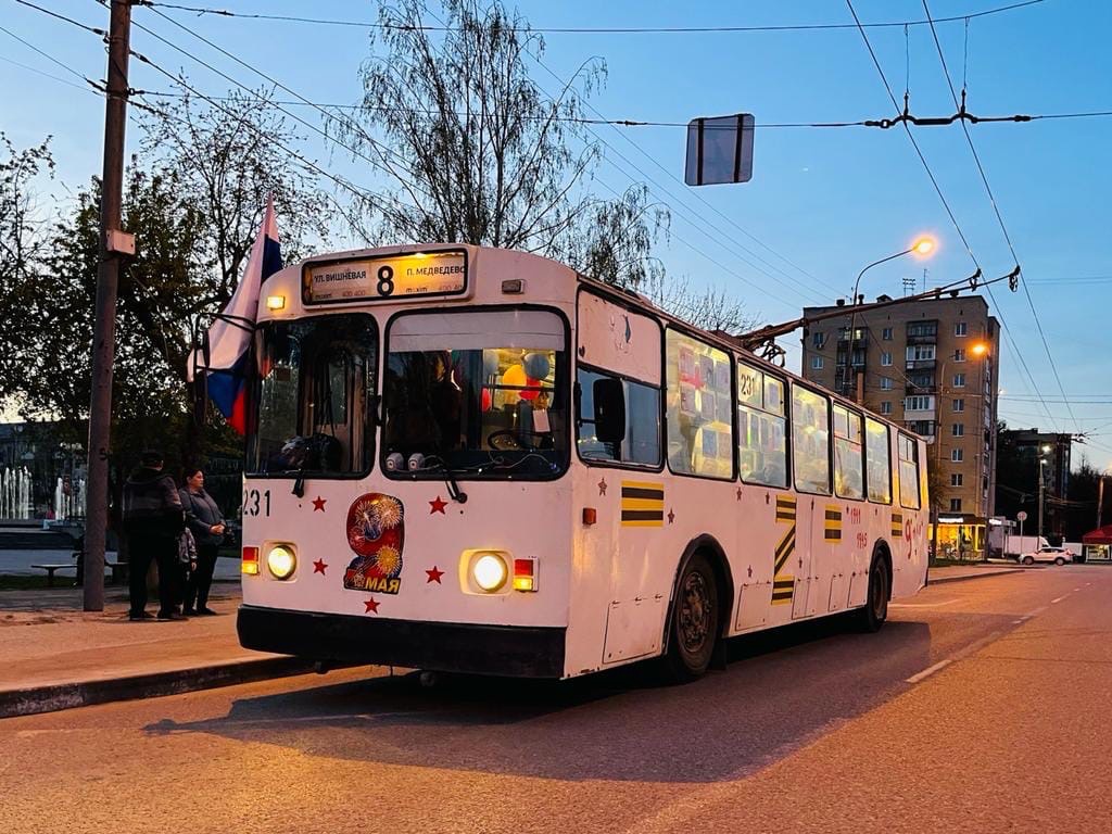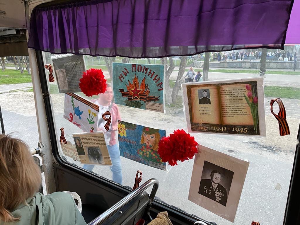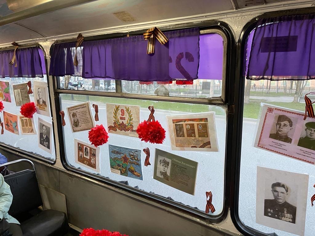 Сами машины украшены георгиевскими лентами, в салонах — детские рисунки на военную тематику и портреты участников Великой Отечественной войны. Троллейбусы ходят по маршруту № 8, уточнили в мэрии города.