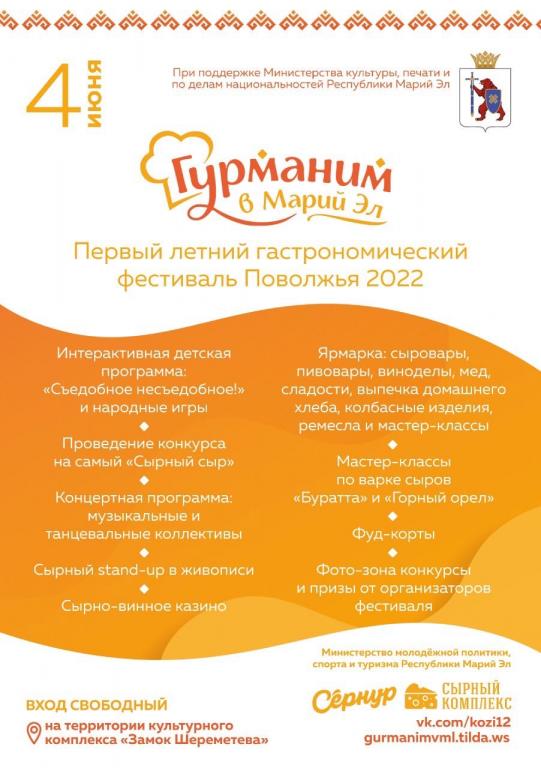 На территории архитектурного ансамбля замка Шереметева в посёлке Юрино 4 июня пройдёт первый летний гастрономический фестиваль Поволжья «Гурманим в Марий Эл».