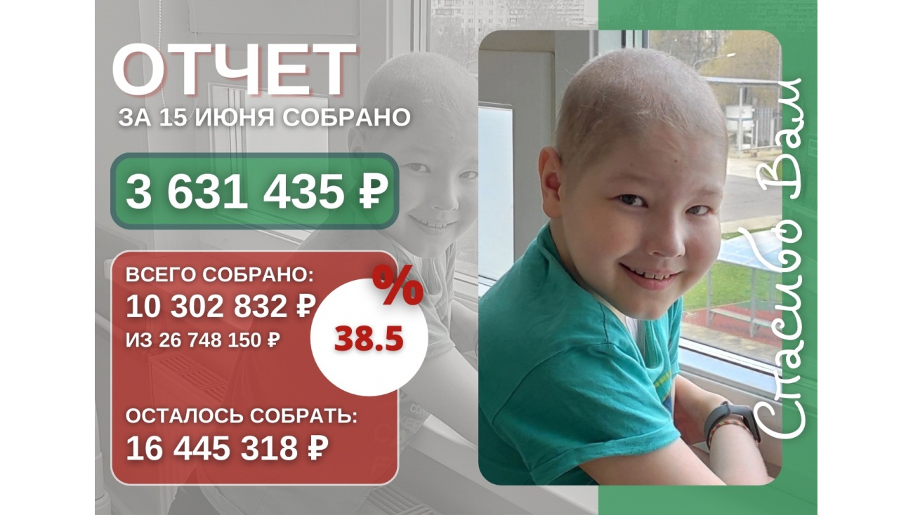 Для лечения за границей (Медицинский центр Шиба, Израиль) требуется огромная сумма — порядка 27 млн рублей. На сегодняшней день собрано 10 302 832 рубля или 38,5% от суммы.