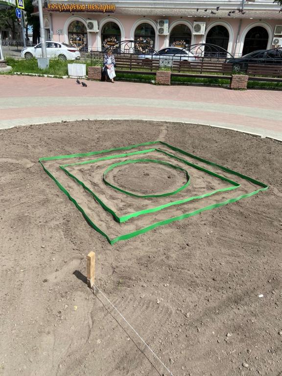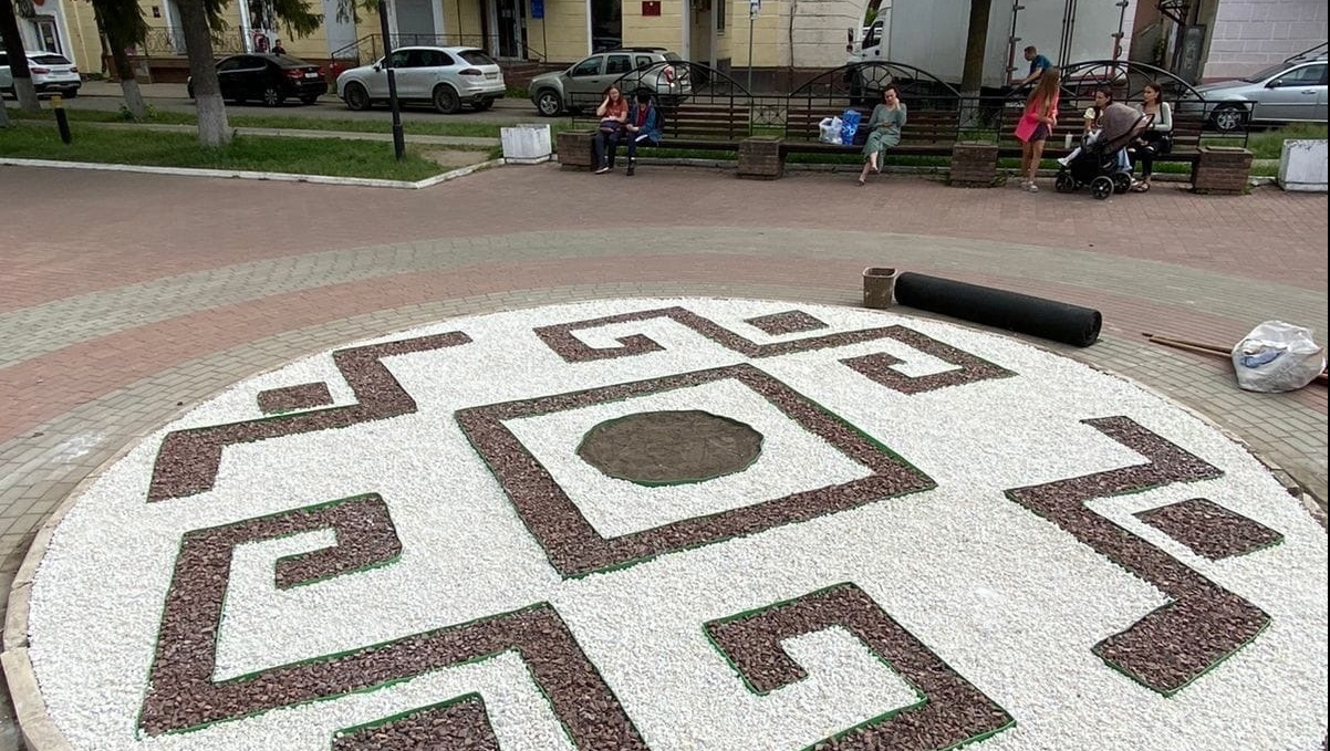 Озеленители МУП «Город» подошли с большой фантазией к его оформлению. Он выполнен в национальный символике и украшен мраморной крошкой.