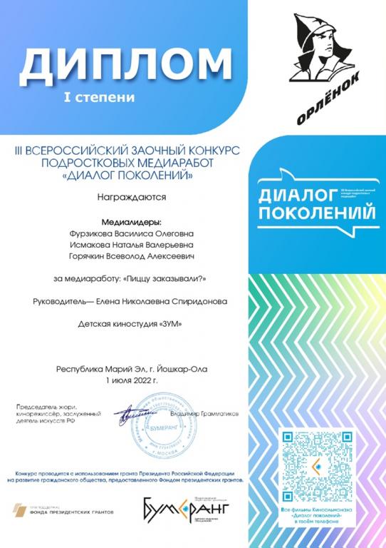 По итогам Всероссийского конкурса «Диалог поколений» ученики детской киностудии «ЗУМ» заняли 1 место и станут участниками XVII Всероссийского открытого фестиваля-форума детского и юношеского экранного творчества «Бумеранг», который пройдет в ВДЦ «Орленок», передаёт пресс-служба мэрии Йошкар-Олы.