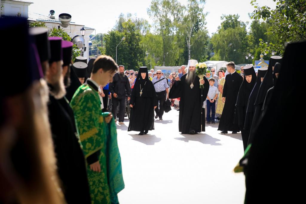 На богослужении вместе с многочисленными паломниками и прихожанами молились настоятельница Дивеевского монастыря игуменья Сергия (Конкова), сестры этой обители, настоятельницы других монастырей РПЦ.
