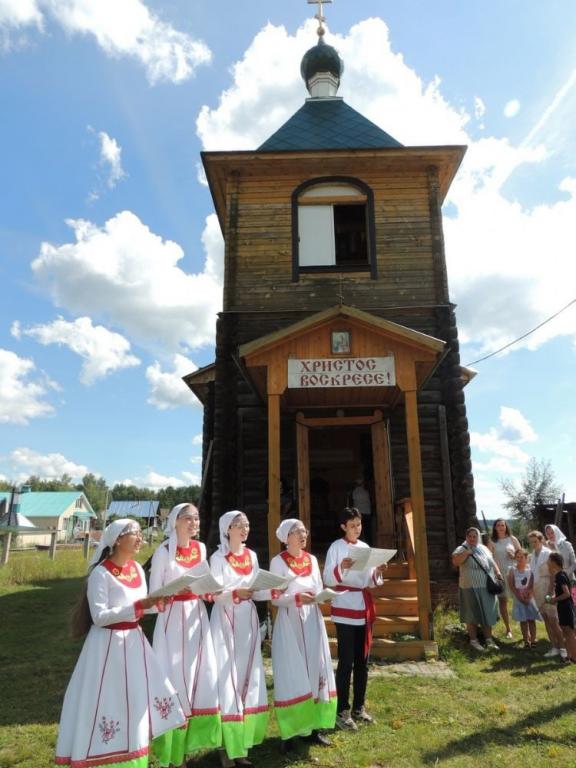 По окончании богослужения верующие прошли крестным ходом вокруг храма. А затем для всех прихожан прозвучал концерт, подготовленный местным фольклорным ансамблем «Юл сем» и хором «Илыш памаш» в красивых национальных костюмах. Были исполнены духовные песнопения и канты на марийском и русском языках.