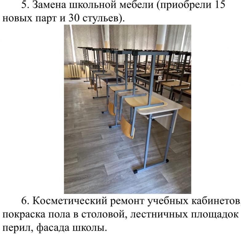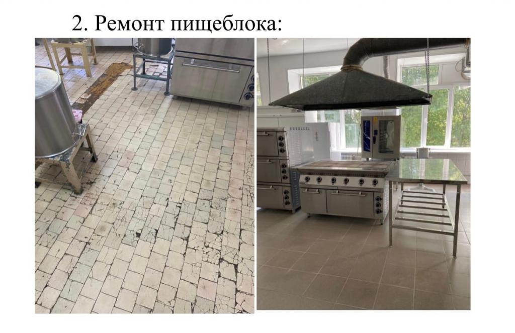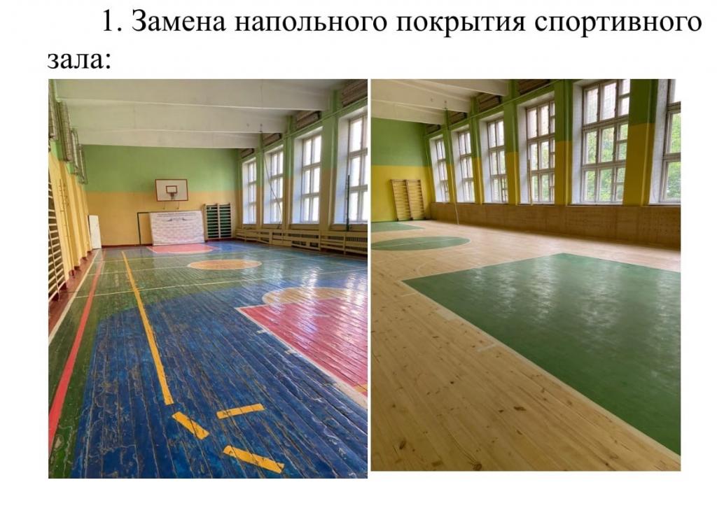 Так, заменено напольное покрытие в спортзале, обновлён пищеблок, отремонтирован и покрашен пол в некоторых кабинетах, столовой и на лестничных площадках. Новыми красками сияет и фасад здания.