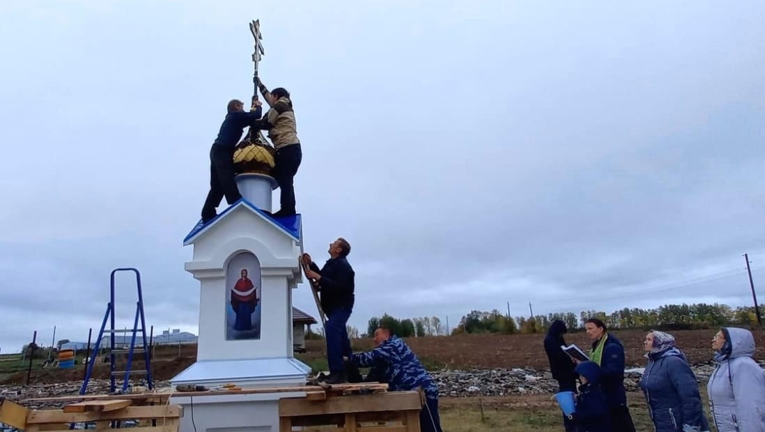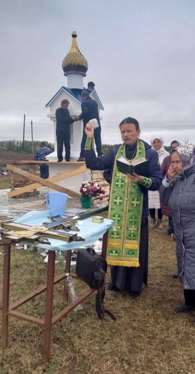 Её строительство было начато этим летом по инициативе местных жителей. И вот 30 сентября на новую часовню уже установили крест, который был освящён настоятелем храма Владимирской иконы Божией Матери села Кузнецово, иереем Василием Яшмолкиным.