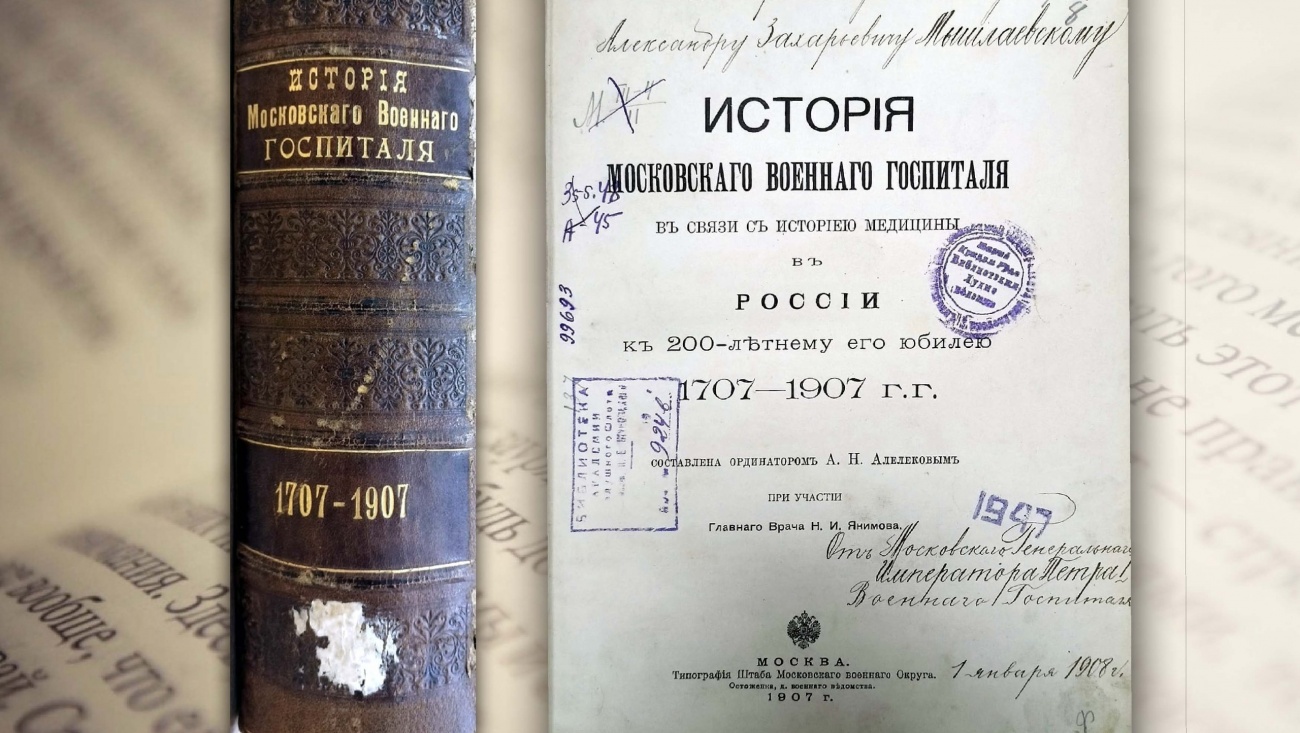 Юбилейная книга «История Московского военного госпиталя в связи с историей медицины в России к 200-летнему его юбилею 1707-1907 г.г.» вышла более ста лет назад в 1907 году в типографии Штаба Московского военного округа.