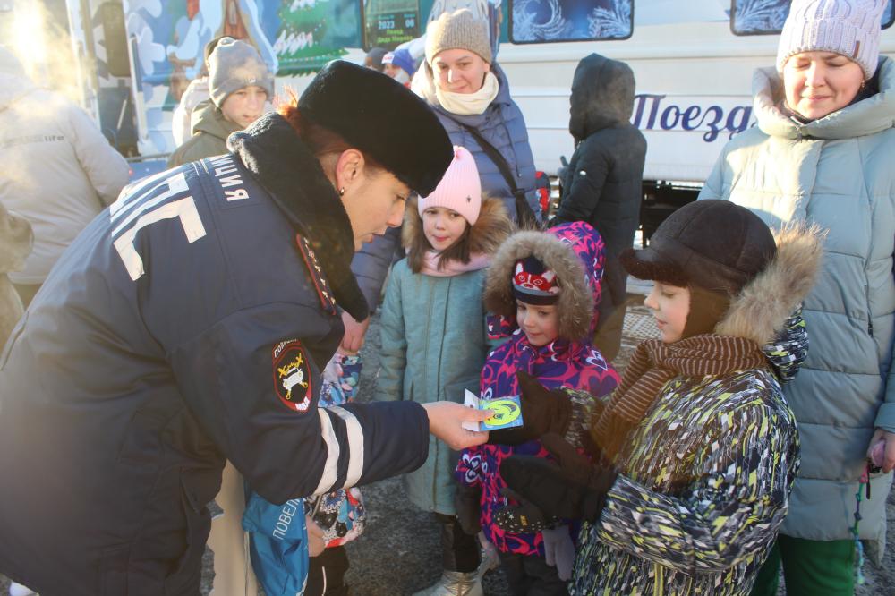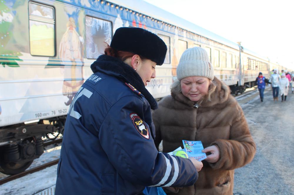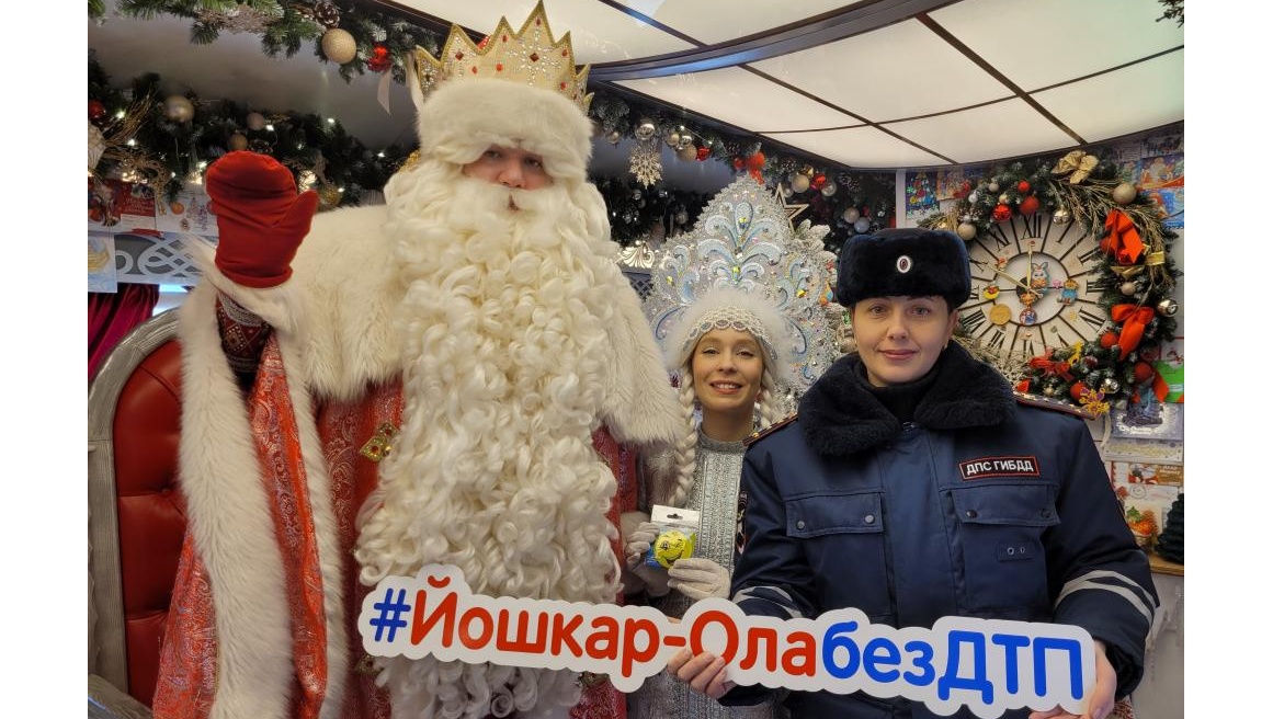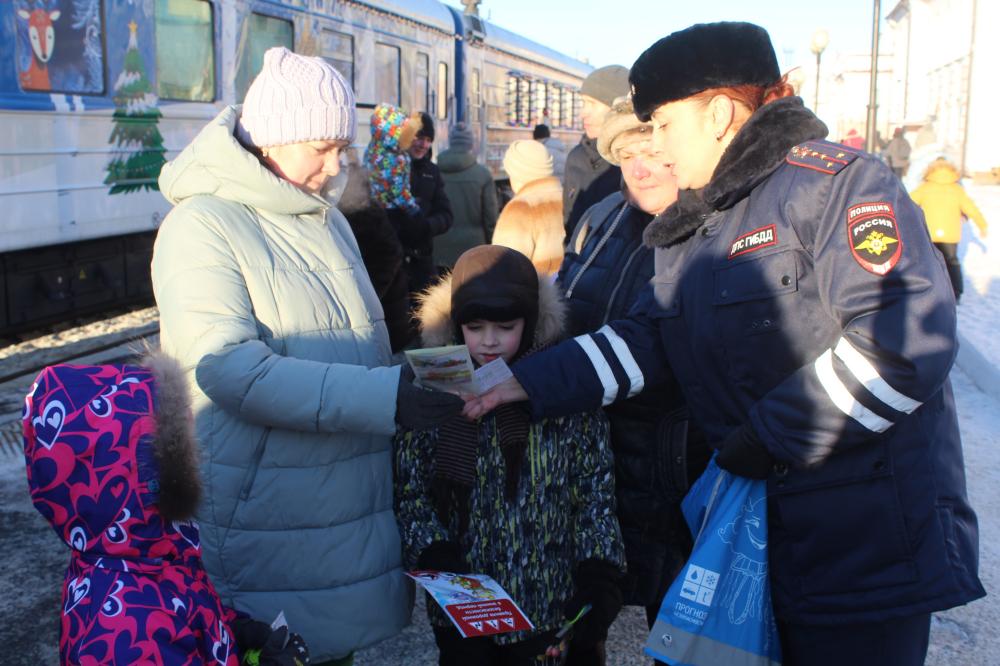 Сегодня сотрудники Госавтоинспекции побывали на железнодорожном вокзале Йошкар-Олы, куда утром прибыл поезд Деда Мороза.