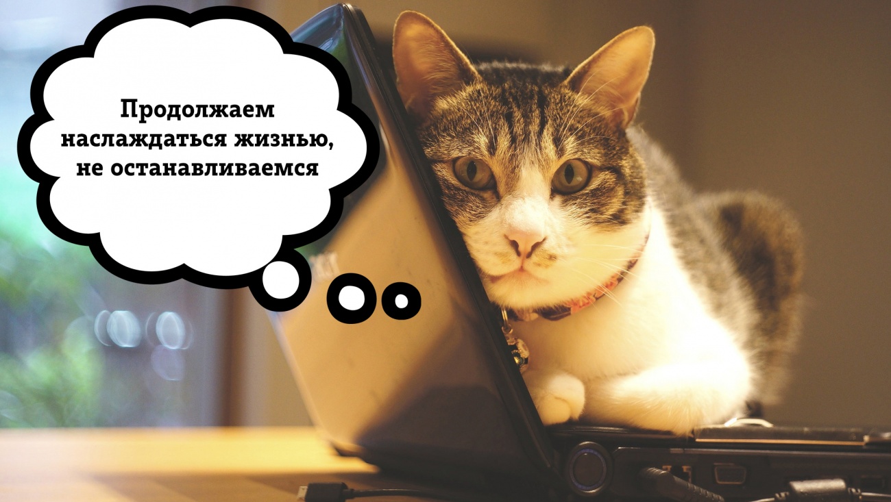 Не делить все на большие или маленькие радости, в этом секрет кошачьего спокойствия. Вкусная еда, хорошая книга, новый сериал, чудаковатый трек залетающего в тренды музыканта, все это приятные моменты только для вас и их лучше смаковать. Замедлитесь на минуту, посмотрите вокруг, весна же. Если что-то тревожит и надо переключиться, 3 минуты смешных видео с кошками сработают как лучший антидепрессант. Только смотрите незаметно от начальства, у настоящих котиков должны оставаться некоторые секреты.