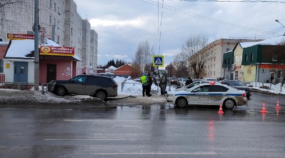 На перекрёстке столкнулись две иномарки Mitsubishi и Renault. В результате удара автомобиль Mitsubishi врезался в светофор, выехал на тротуар, где сбил 37-летнюю женщину-пешехода.