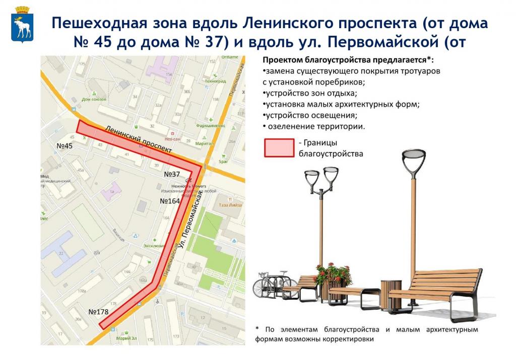- 5. Пешеходная зона вдоль Ленинского проспекта (от дома № 45 до дома № 37) и вдоль ул. Первомайской (от дома № 164 до дома № 178),