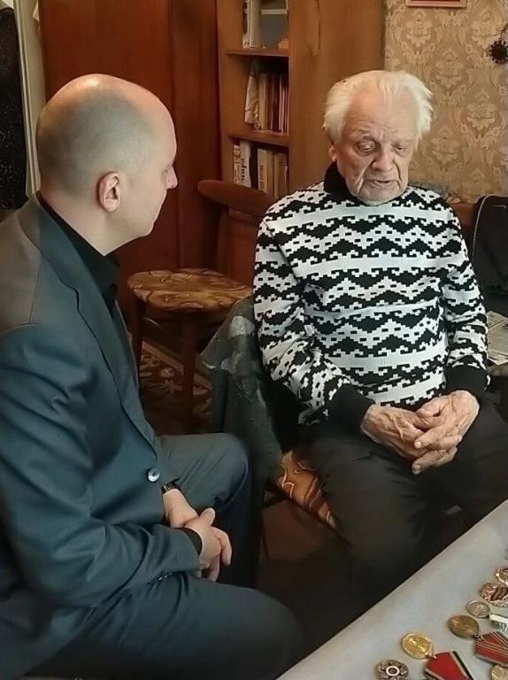 Евгений Маслов пообщался с ним и его семьёй, вручил подарок и поблагодарил за Великую Победу.